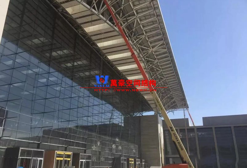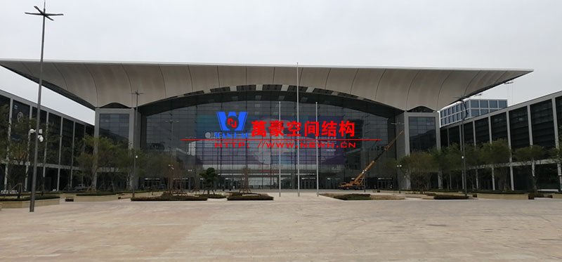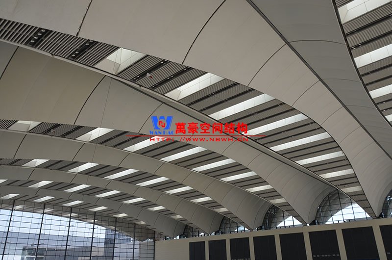 會展中心的入口大廳采用全透明幕墻,將南北向迥然不同的城市景觀聯(lián)系起來,輕質半透明屋頂覆蓋入口大廳的公共區(qū)域,輕盈的白色薄膜材質配以照明燈光,使整個大廳明亮而通透。該膜結構幕墻項目由寧波萬豪空間結構工程有限公司承建,項目完成的十分完美。