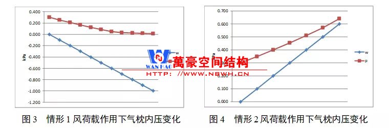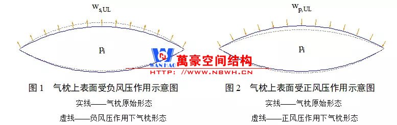 其中風荷載是氣枕設計時一個主要涉及的荷載類型,但很多設計人員在進行膜面強度校核時并不知如何正確的進行風荷載的施加,亦不甚了解氣枕受正風壓作用和負風壓作用有什么區別(見圖1,圖2),部分設計者由于計算軟件的缺乏并不能獲得風荷載作用下的氣枕內壓,常常直接采用風荷載值作用于受風膜面進行計算,或采用風荷載和氣枕初始內壓直接疊加施加于受風膜面進行計算。但因為氣枕通常包含上、下層兩層柔性的膜面及相對封閉的膜氣腔內的空氣,在風荷載作用下這三者必將發生聯動反應:膜面發生較大的形態變化,即氣枕體積發生變化,氣枕內壓的也必然會隨之發生變化,氣枕膜面也必然處于風荷載和其內壓共同作用。