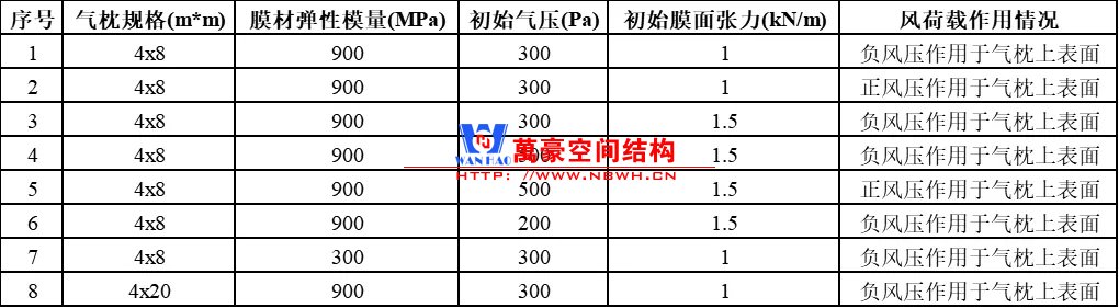 根據上一章節中列出的8個情形,在本章給出了在不同風荷載值下的氣枕內壓值,以圖表的形式: