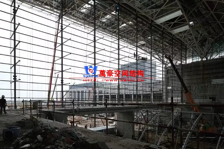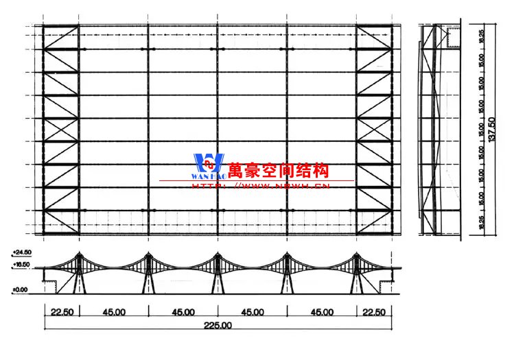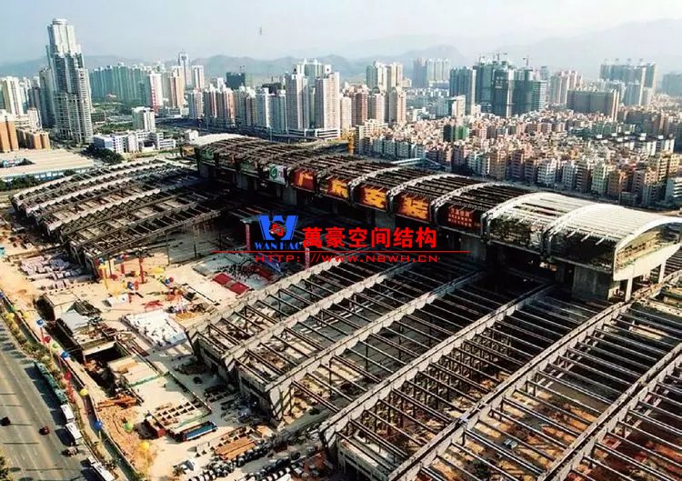 126m的跨度在2001年被譽為“中國第一跨度”。結構設計中采用了一系列措施讓這個“中國第一跨度”在確保建筑意圖的前提下得以高效實現。大型屋面采用下張弦體系減少鋼梁彎矩,為了獲得與鋼箱梁匹配的剛度,下弦采用了直徑最大為150mm的高強鋼拉桿,這一設計也間接推動了國內自主高強鋼拉桿的高速發展。施工過程中采用了先滑后固的方式釋放了自重下的柱腳水平推力,減少結構內力。采用連續梁檁條,大幅度降低了30m跨度檁條的用鋼量。
