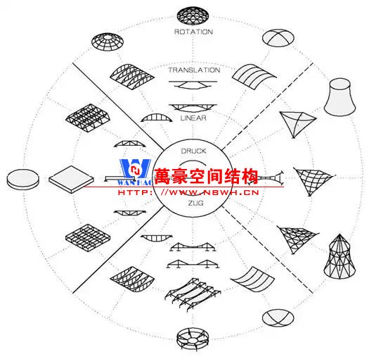 網殼結構的定義有三個關鍵詞:“曲面”、“桿件”、“薄膜作用”。我們從而可以找到網殼結構在結構體系中的位置。