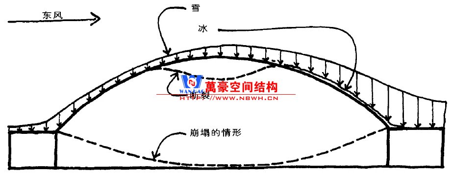 當晚,大雪在風力作用下在穹頂上產生了飄移,雪堆積在背風面造成了不均勻荷載。雖然總體雪荷載只有設計總荷載的1/4,但卻集中在屋頂表面的1/3區段,不均勻荷載分布造成了倒塌。