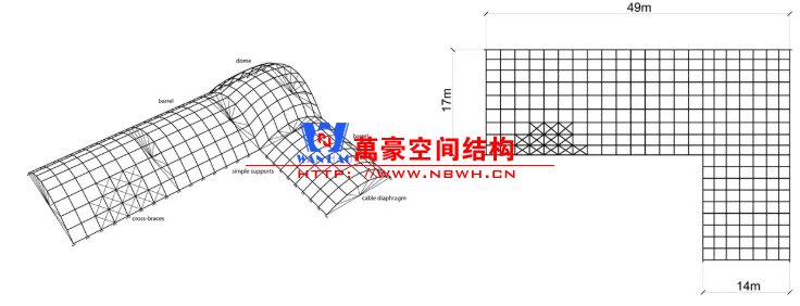屋面結構在L形的兩部分采用了單曲的筒殼,交匯處采用了雙曲殼體。殼體采用四邊形網格劃分,這樣的網格劃分形式可以看作一榀榀拱排列著,拱之間用縱向用桿件聯系。