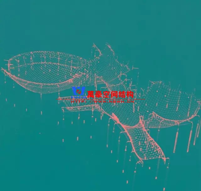 桿件通過螺栓與中間圓柱形節點相連,正交拉索連接網格的對角節點,以增加網格剛度。拉索不僅增加了剛度,也減小了桿件承受的彎矩。