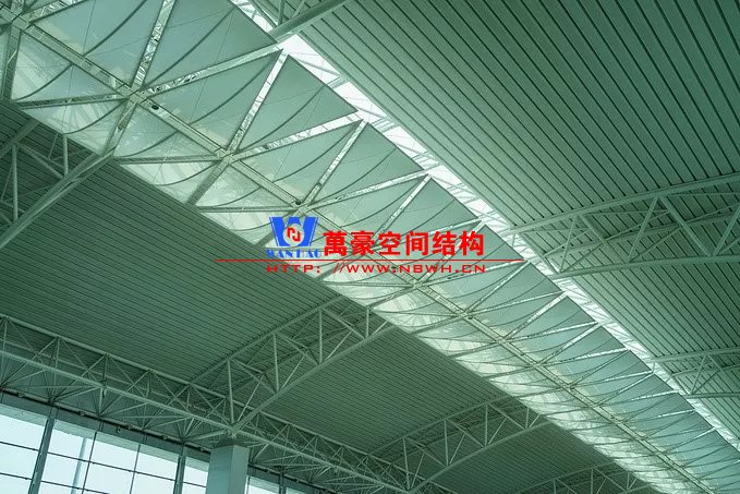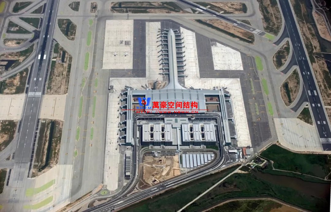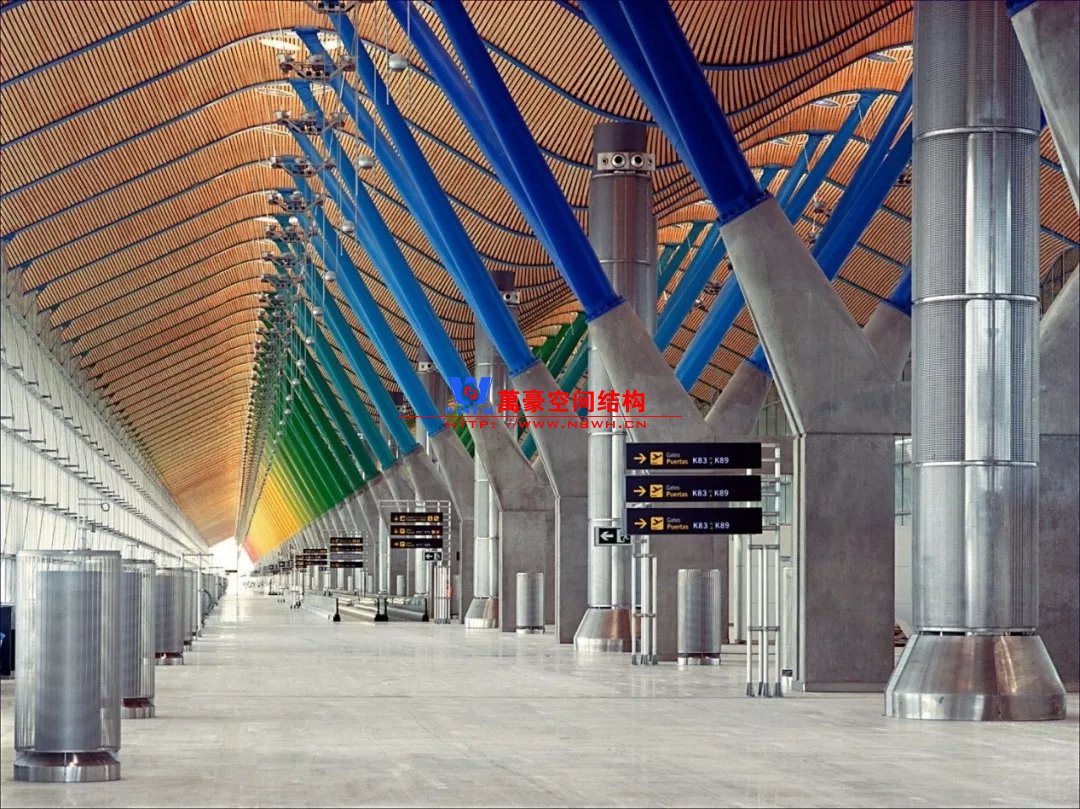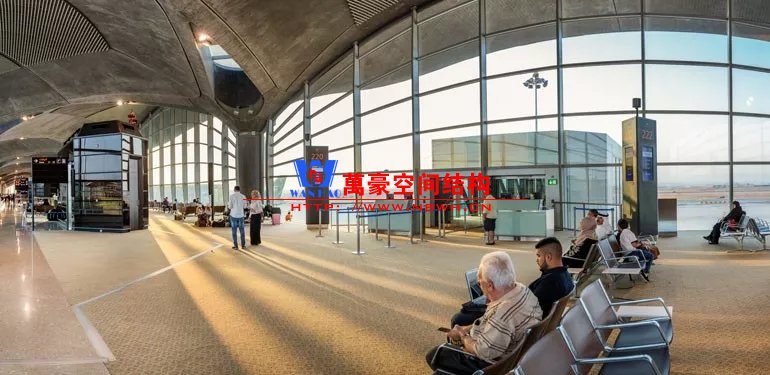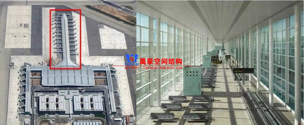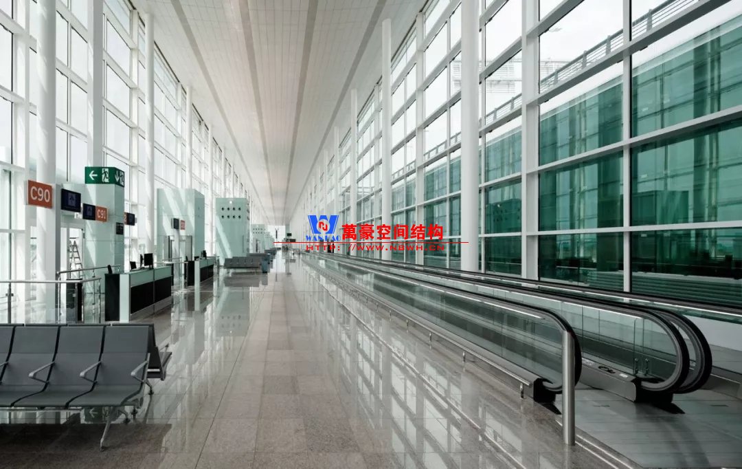 如巴塞羅那機場的指廊就是采用簡單的鋼框架結構體系,鋼柱布置于兩邊;幕墻采用剛性幕墻,貼近鋼柱外側布置;室內吊頂無天窗,吊頂走向沿長向,空間上有指向性。