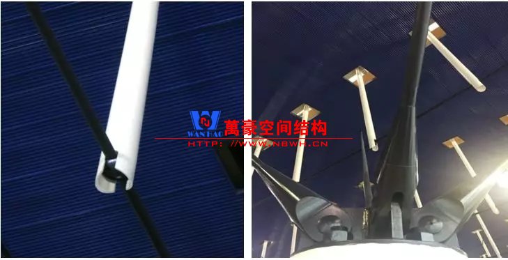 為了豐富室內空間,建筑師還增加很多小細節。比如室內柱子的顏色是漸變的,這樣沿著指廊前進時就不會顯得那么單調;吊頂并沒有將鋼梁全部包掉,而是露出了鋼梁的下翼緣,這樣就能在遮掉次梁檁條等比較雜亂構件的同時表現出結構的肌理,同時由于結構外露,所以結構工程師節點設計也很考究;頂部結構比較“硬”,所以幕墻采用了比較“軟”的索桁架半剛性幕墻,立面顯得極為通透。