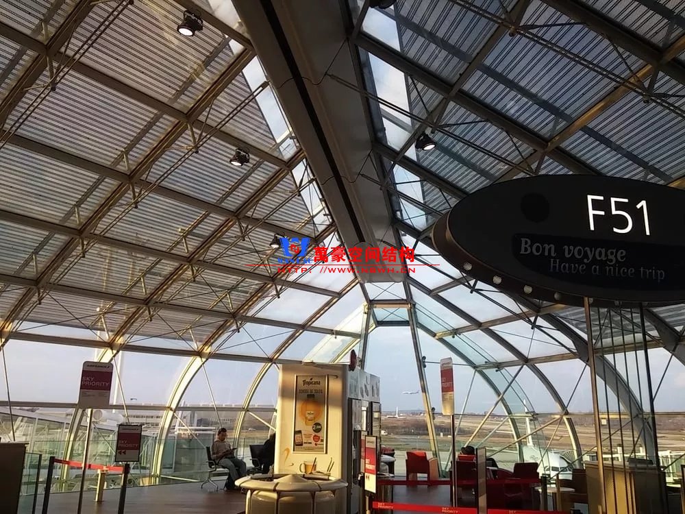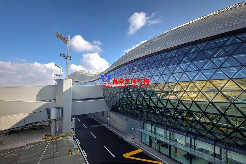 克羅地亞札格瑞布機場剖面也是筒形,結構采用網架結構,但網架沒有外包。網架構件和網架球節點直接暴露在近人的尺度,但從照片上看并沒有顯得很雜亂,這可能是因為結構構件和節點的尺度控制的很好,細而密的構件顯得比較精細。
