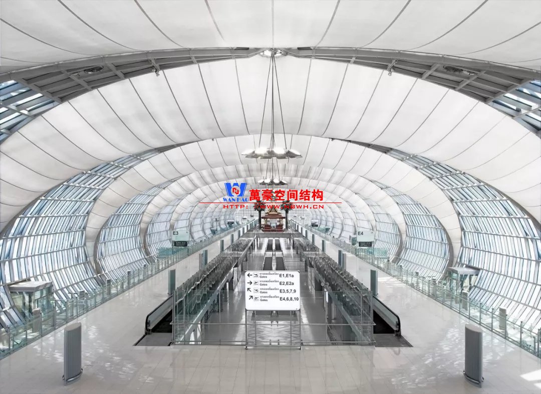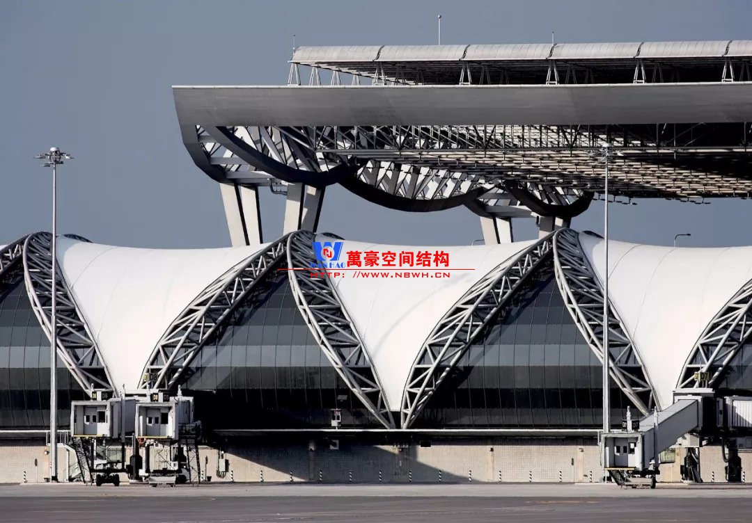曼谷素萬那普機場同樣的形式設計出了不同的效果。前面兩個機場在室外是平滑的,而素萬那普機場選擇了空間桁架結構,且讓桁架暴露在建筑立面外側,形成建筑表達的一部分。結構體系從剖面上看利用了類似三鉸拱的概念,同時桁架高度與彎矩圖相符。立面則選用了剛性幕墻,整個建筑表達出了結構的力度感。