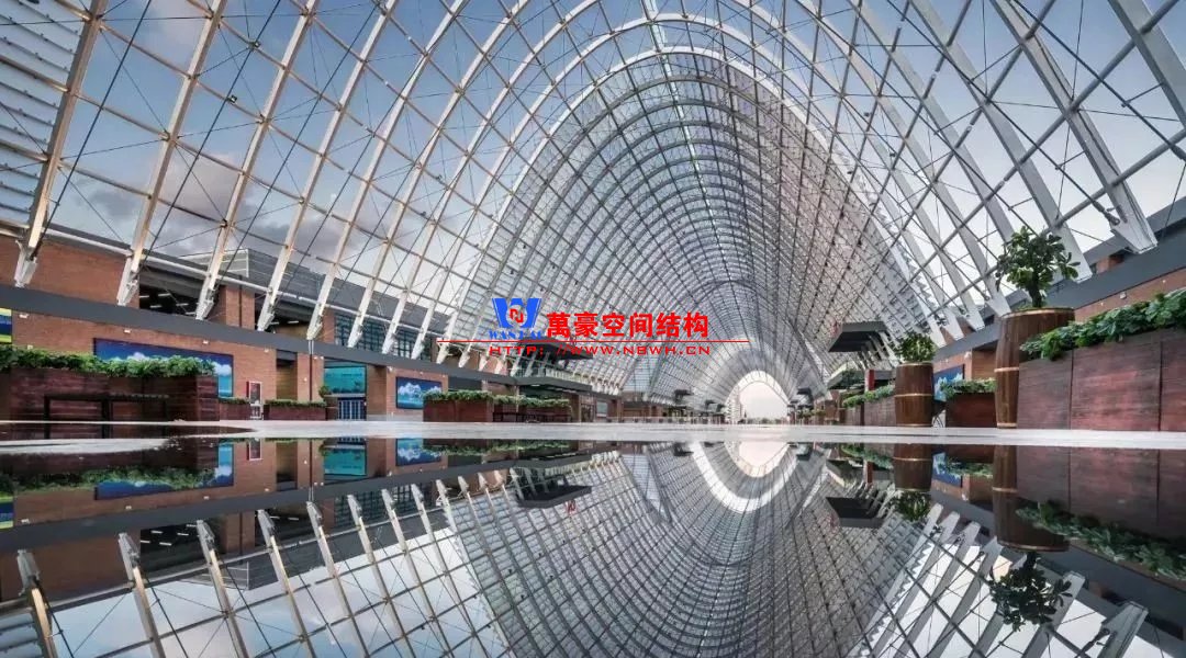 建筑內(nèi)在的空間結(jié)構(gòu)形成了外部形態(tài)的美學(xué)韻律和視覺沖擊力,使建筑形象真實(shí)而動(dòng)人。包括展廊與展廳兩部分,以中央十字展廊為功能組織核心,南北各布置6個(gè)、共12個(gè)獨(dú)立展廳單元(尺寸74.4m×136.4m,采用變標(biāo)高的空間桁架鋼結(jié)構(gòu))。展廊平面呈十字型布置,東西向長507m,南北向長287m,主拱和次拱方向分別設(shè)置兩道溫度縫,最高點(diǎn)標(biāo)高為35.0m。