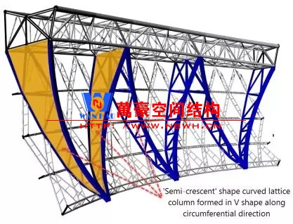 盧賽爾體育場(chǎng)外形就像一個(gè)碩大的“金缽”,其主體及看臺(tái)鋼結(jié)構(gòu)總用鋼量約3萬噸,相當(dāng)于三個(gè)埃菲爾鐵塔的重量。V柱是項(xiàng)目主體鋼結(jié)構(gòu)的重要組成部分,總重量約為6271噸,是“金缽”主要的豎向傳力系統(tǒng),為壓環(huán)以及幕墻側(cè)壁結(jié)構(gòu)提供支承,并將豎向力傳遞到混凝土柱墩上,進(jìn)而傳遞到地面。
