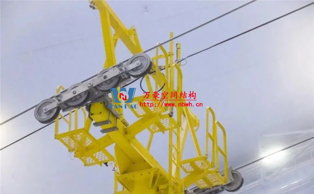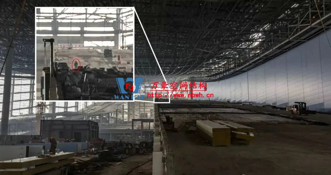 水雪綜合體高中低三區屋蓋,需要采用不同的安裝方式。低區屋蓋直接在地面拼裝,然后再吊裝就位;中區屋蓋需要采用原位拼裝+整體累計提升的方式;高區屋蓋則采用累積滑移+局部提升的方式,沿滑雪道布置兩條大滑梯,地面拼裝后再將鋼材部件順著滑梯滑上去,到達固定位置時對接安裝好完成。