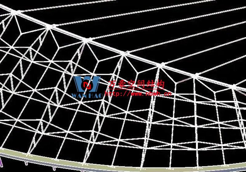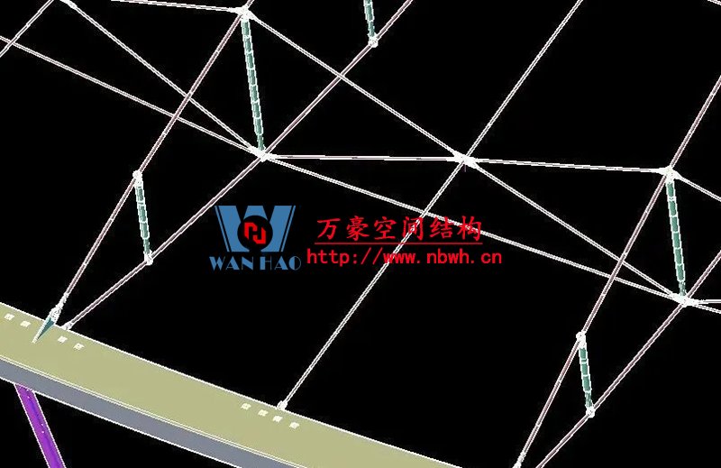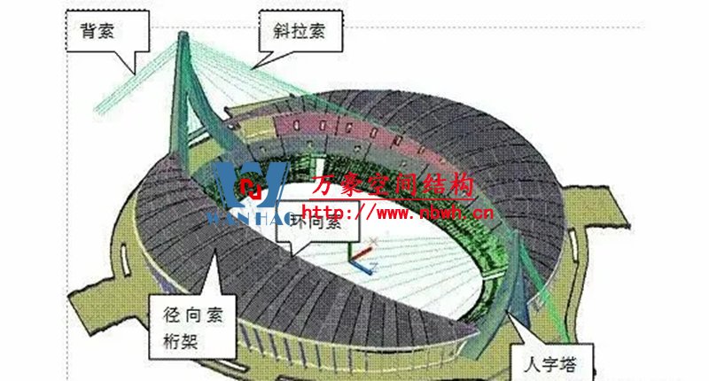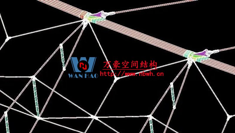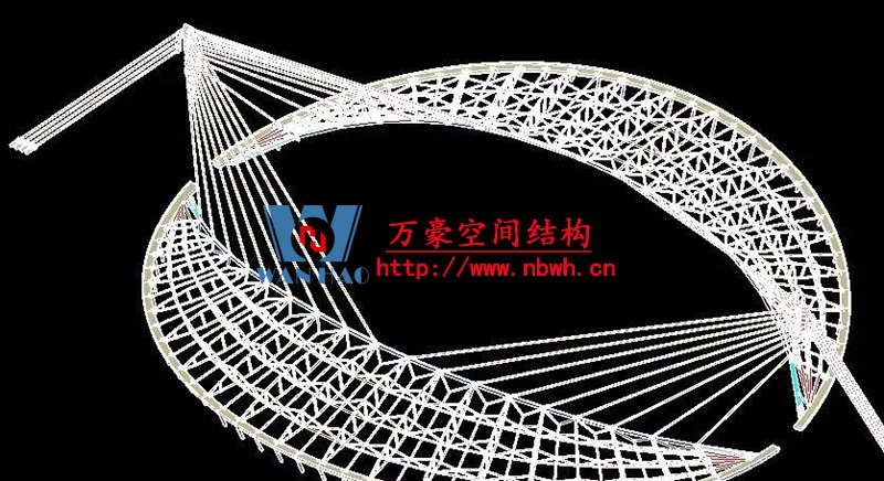 1、整個(gè)索網(wǎng)、環(huán)梁和吊塔形成整體受力體系,結(jié)構(gòu)受力傳遞路徑復(fù)雜;