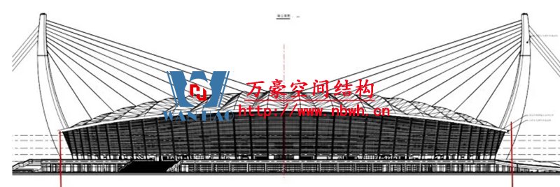 體育場(chǎng)看臺(tái)罩棚采用新型索桿張力結(jié)構(gòu)形式 —— 斜拉-索桁張力結(jié)構(gòu),該結(jié)構(gòu)在較為常見的索桁架結(jié)構(gòu)體系中又引入了斜拉索的作用。