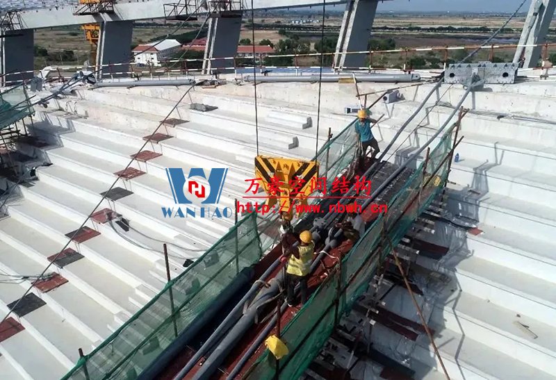 走進(jìn)援柬埔寨國(guó)家體育場(chǎng),現(xiàn)場(chǎng)張拉施工正在如火如荼的進(jìn)行,最長(zhǎng)達(dá)160米的巨型鋼索綿延環(huán)繞在體育場(chǎng)四周,猶如盤踞的巨龍。兩個(gè)高達(dá)99米的人字形吊塔一端拉起18根斜拉索,另一端連接8根背索,與索桁架共計(jì)1100鋼索將看臺(tái)罩棚高高擎起。從空中望去,猶如在一把天傘被中部鏤空,再被兩把豎琴輕輕吊起,整體結(jié)構(gòu)氣勢(shì)恢宏,美輪美奐。目前,體育場(chǎng)罩棚索網(wǎng)張拉施工已圓滿完成。