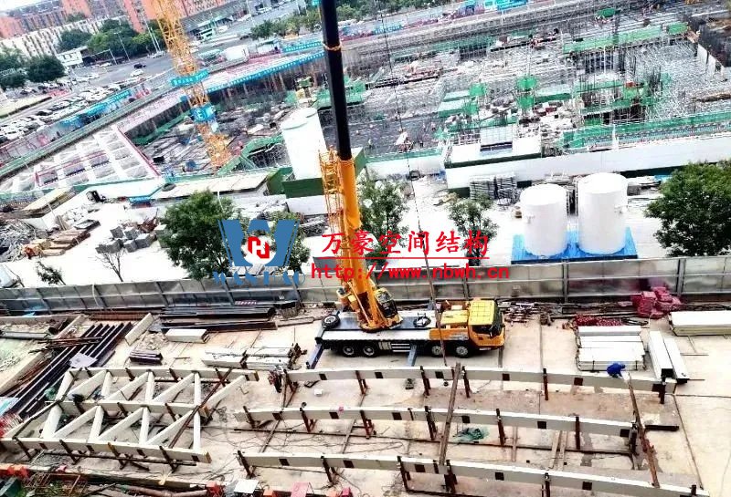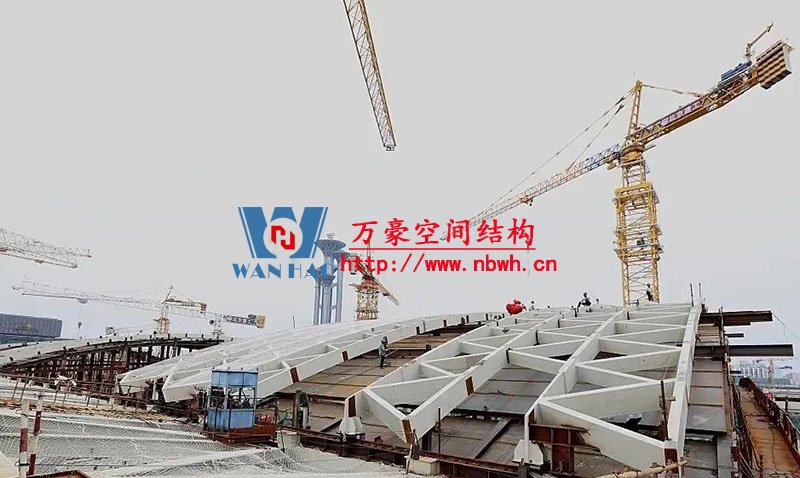 正在滑移施工的鋼屋面網殼用鋼量約2800噸,南北長168米,東西跨度72米,鋼屋蓋網殼面積大,距離地面高度為44米-52米,高空作業量大,構件吊次多達3000次,吊裝時間約2個月,工期緊,鋼結構焊接精度和質量要求極高,屋蓋網殼為索承結構,控制變形難度大。