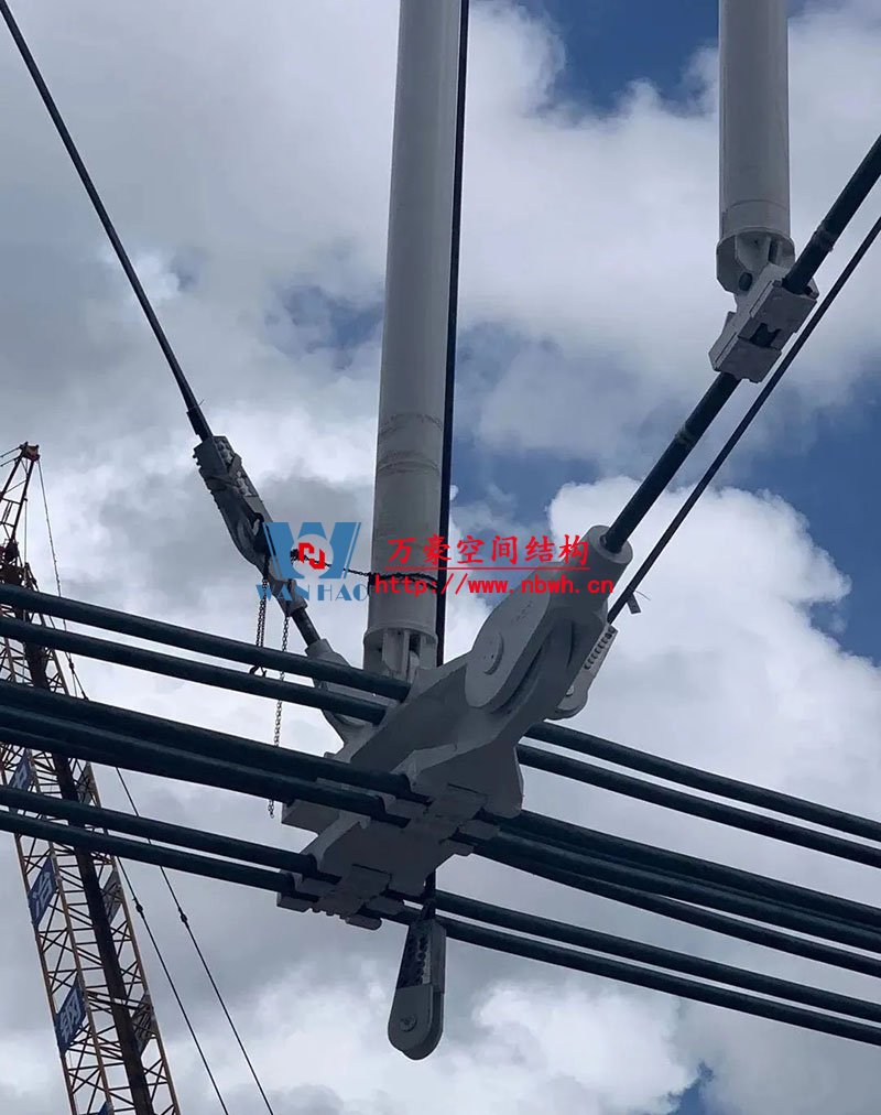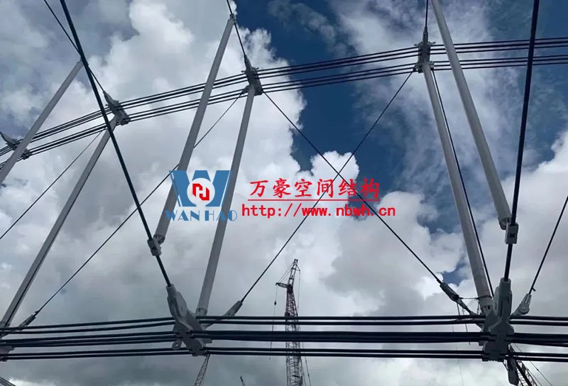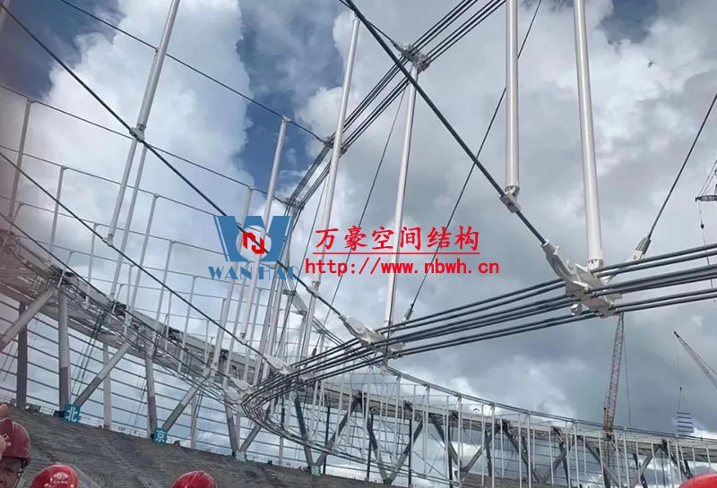 在施工現場,一行人查看了索結構的施工情況,重點查看了上下環索間的交叉索——碳纖維索(CFRP索)的安裝情況。岳清瑞表示,盡管碳纖維索初次應用,從材料的用量到加工技術的選擇等方面,都確保足量和保守,有很多的安全儲備,但是在施工現場已經能夠看到碳纖維索不同于鋼索的輕盈的感覺,效果非常好。張晉勛表示,索結構材料的選擇恰當,目前采用的國產高釩密閉索以及碳纖維索等材料組合使用,可以將它們各自的特點與功能發揮好,共同服務整個索結構。