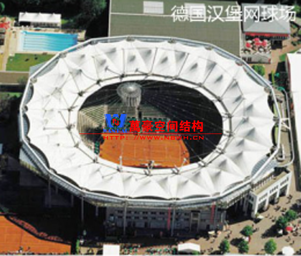 德國漢堡網(wǎng)球場膜結(jié)構(gòu)展開面積約10000平方米,采用PVC(PVDF面層)膜材。屋頂是可開合式膜結(jié)構(gòu),這種屋頂能確保在任何季節(jié)舉行網(wǎng)球比賽,避免重要賽事因天氣原因中斷或延遲。
