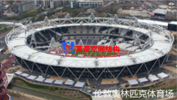 倫敦奧林匹克體育場在奧運和殘奧期間是8萬座位的體育場,賽后轉(zhuǎn)換成一個2.5萬座位的體育場。人字形柱支承外壓縮環(huán)桁架,內(nèi)張力環(huán)采用索,其間輻射布置雙層徑向索形成索網(wǎng),上覆112片PVC膜材張緊形成罩蓬,是典型的索系支承式膜結(jié)構(gòu)。