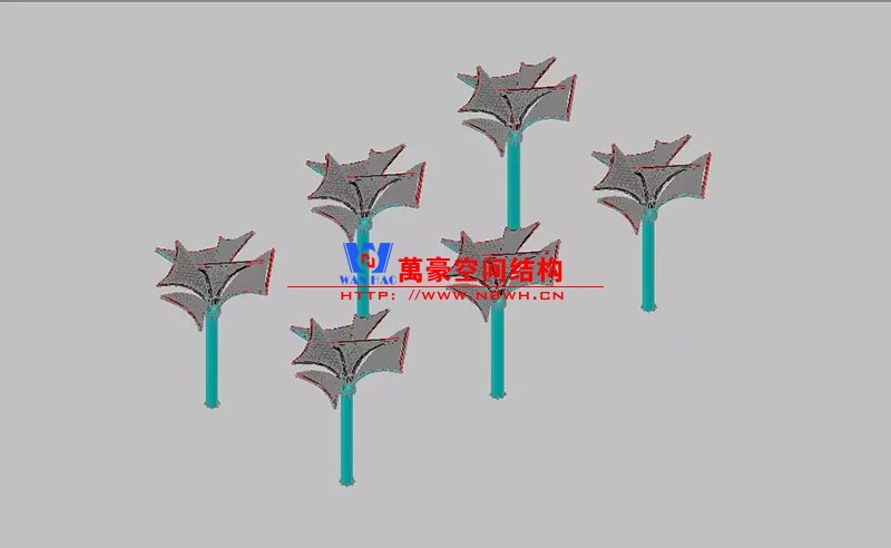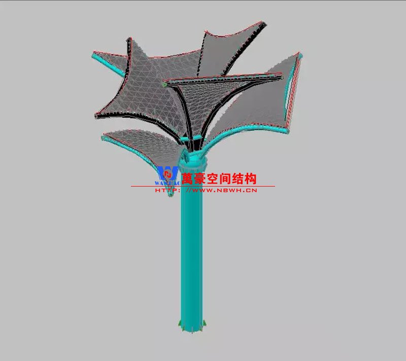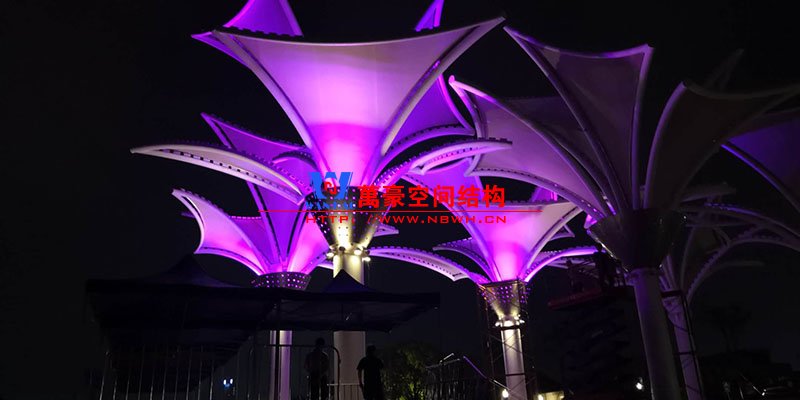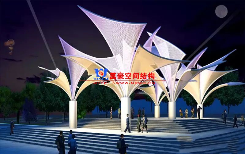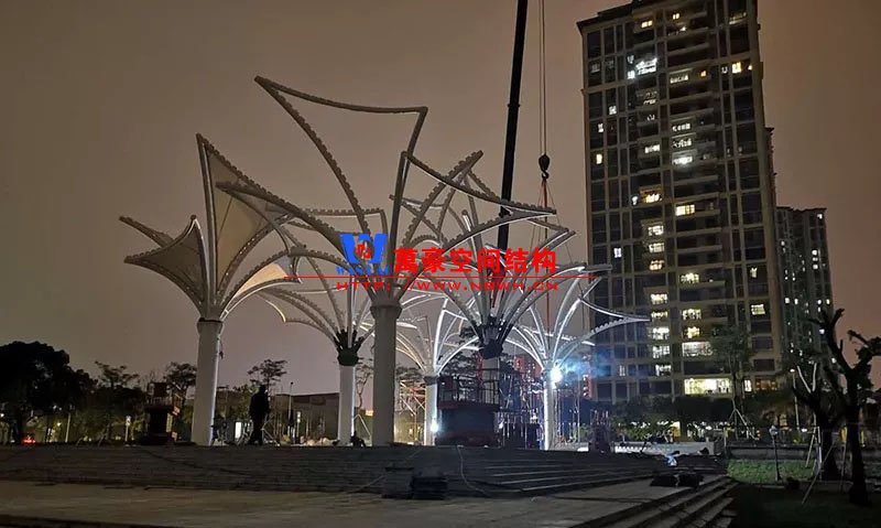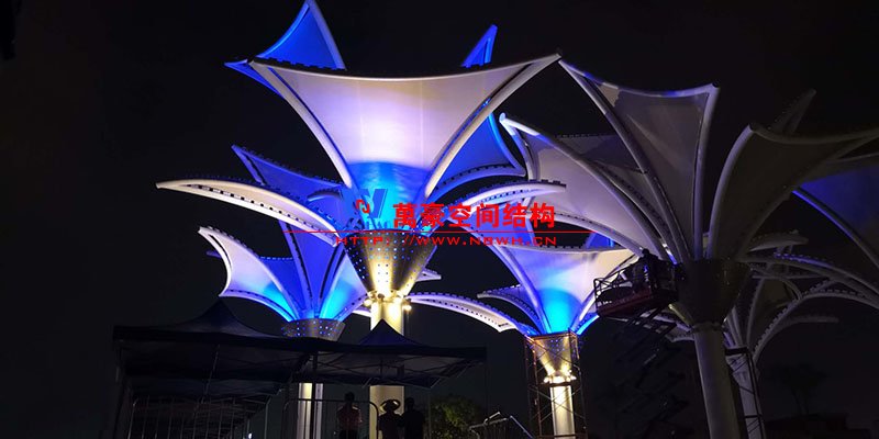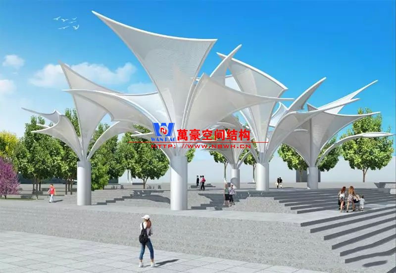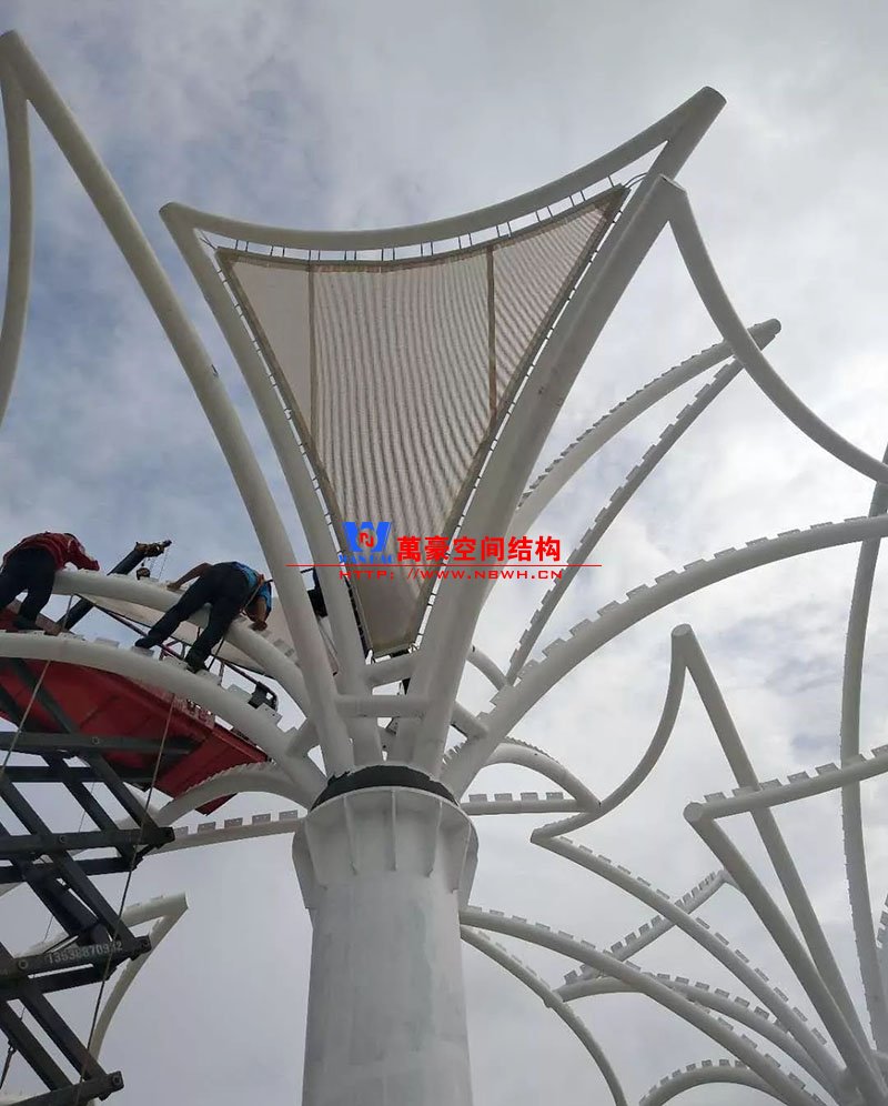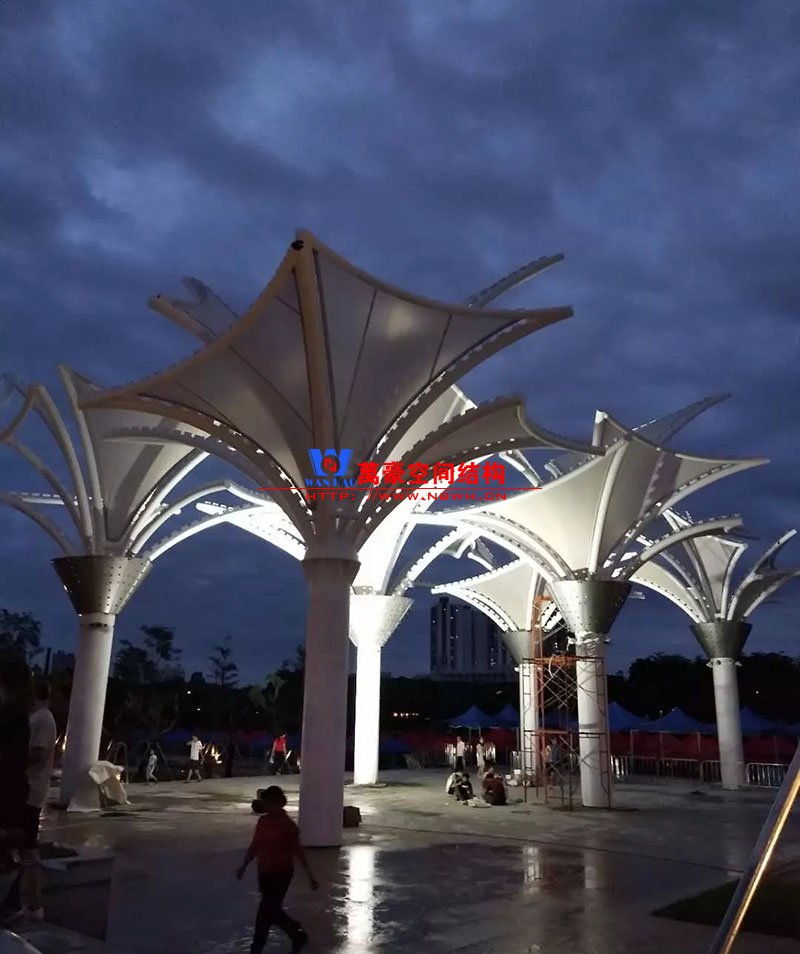 其中主席臺龍舟拉膜項目高度為7.25米,膜結構屋面材質為PTFE膜材。廣場鋼拉膜項目由六個龍船花造形景觀組成,每個龍船花景觀造形立柱的高度不得低于3.80米,花瓣造形最低高度 7.54米,花瓣造形最高高度9.608米,膜結構屋面材質為 PTFE網格基布雙面貼透明ETFE建筑膜。