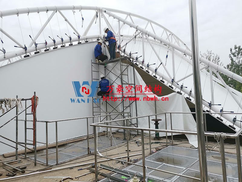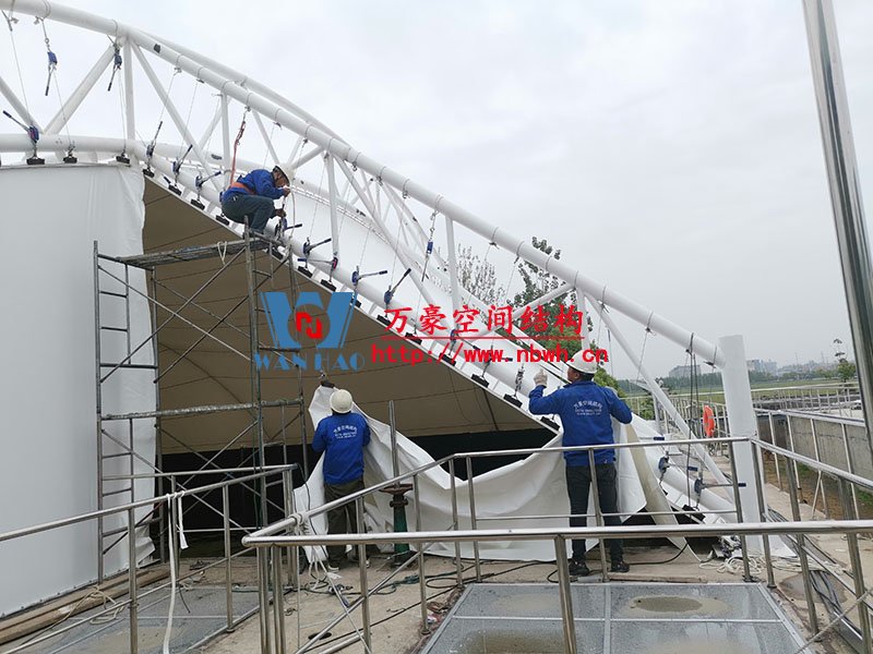 淮安鹽化新材料產(chǎn)業(yè)園區(qū)污水處理廠膜結(jié)構(gòu)項(xiàng)目位于江蘇省淮安市,由寧波萬豪空間結(jié)構(gòu)工程有限公司承建。該項(xiàng)目采用碳鋼骨架(外側(cè))+聚酯纖維(反吊)結(jié)構(gòu)形式,造型美觀,經(jīng)濟(jì)適用。