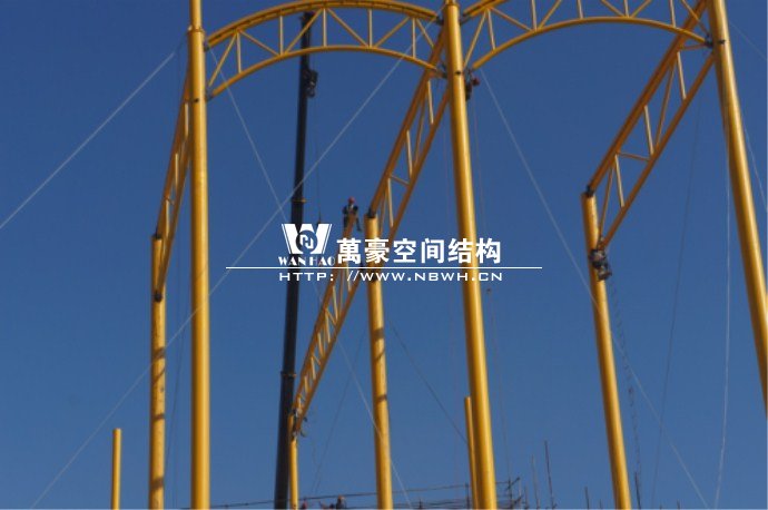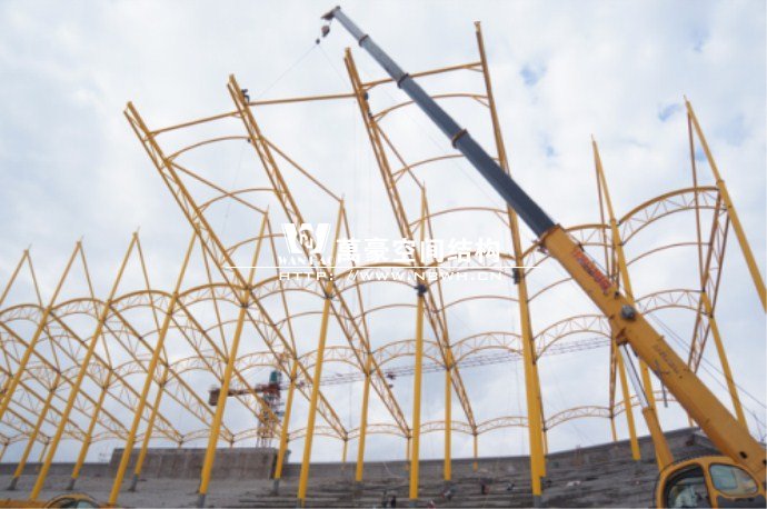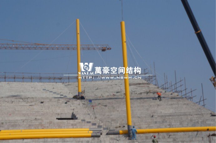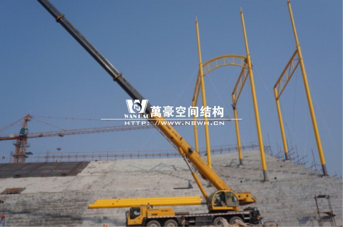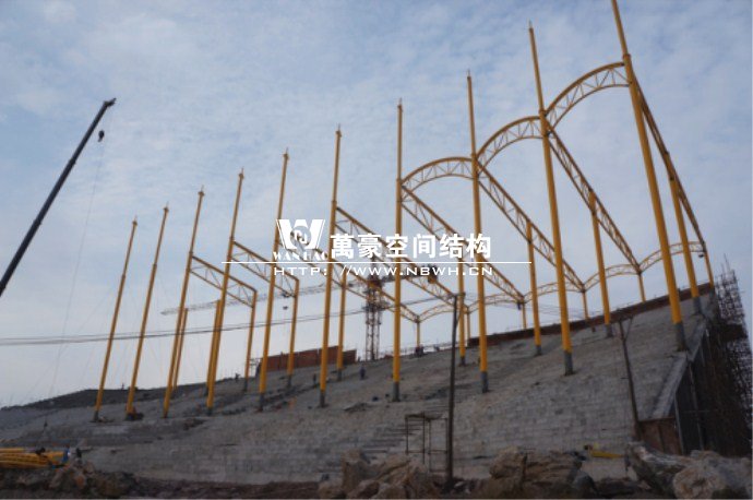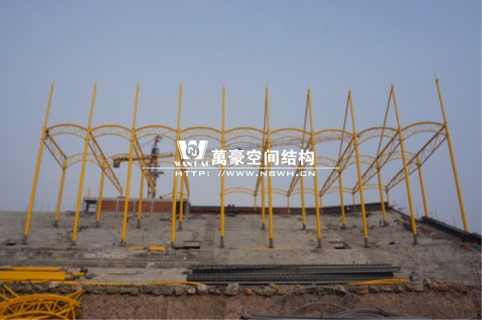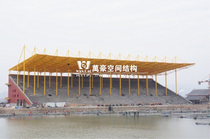 橫店影視城被一圈連綿起伏的山巒包圍著,層疊的遠(yuǎn)山宛如水墨畫。圓明新園則位于小鎮(zhèn)西邊的山巒中,芳草萋萋、溪水潺潺!花仙湖膜結(jié)構(gòu)看臺坐落于圓明新園春苑東北角,為骨架支撐式膜結(jié)構(gòu),建筑面積約為16000㎡,看臺主體結(jié)構(gòu)可分為15個單元,屋面膜結(jié)構(gòu)則由30片膜組成。主體結(jié)構(gòu)劃分為四大部分:鋼柱、主桁架、次桁架和馬道。鋼柱高34.76米,單個重量達(dá)8.2噸;主桁架長70.66米,柱間距15米,看臺屋面猶如浮動的金色流云,徜徉在花仙湖上空。此項目為全國最大的“水戲”表演建筑的看臺,同時也是水上樂園彩色膜結(jié)構(gòu)最大的一個景觀。